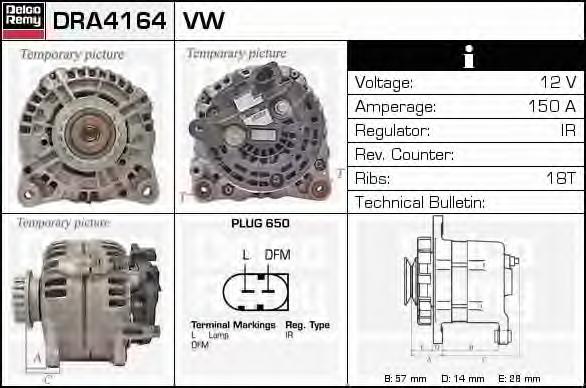GENERATOR / ALTERNATOR DELCO REMY DRA4164 pentru VW TRANSPORTER V platou / sasiu (7JD, 7JE, 7JL, 7JY, 7JZ, 7FD, 2.5 TDI |
